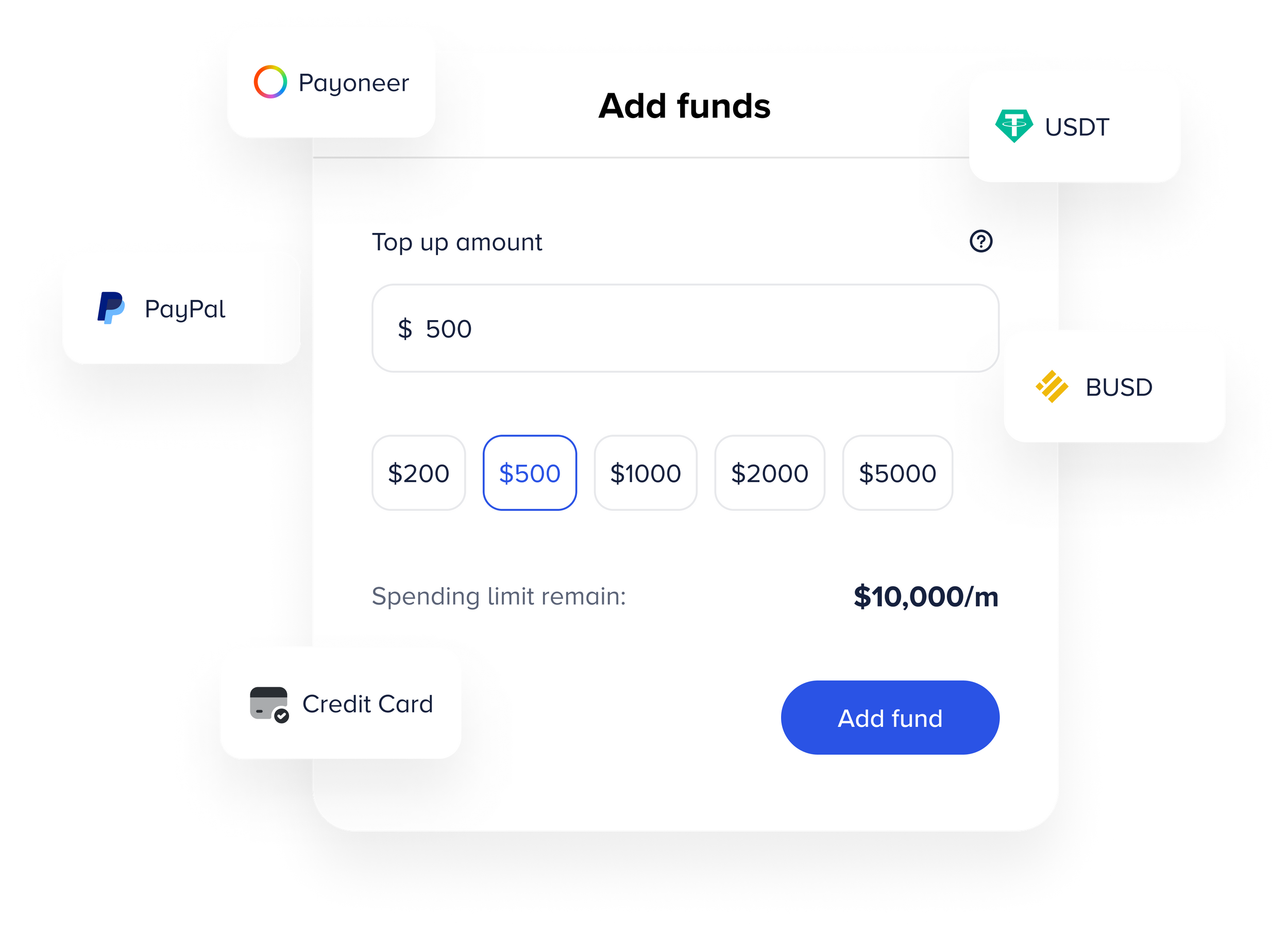 Top up and withdraw easily via multiple payment methods: Credit Card, Payoneer, PayPal, USDT and BUSD.